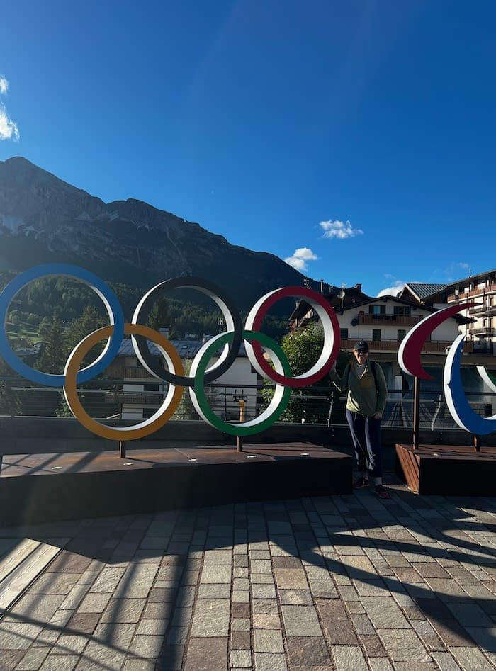 This charming village was abuzz with activity when we arrived. Cranes dotted the skyline as the town was preparing to host the 2026 Winter Olympic Games, and the iconic rings were already set up — perfect for snapping a photo.