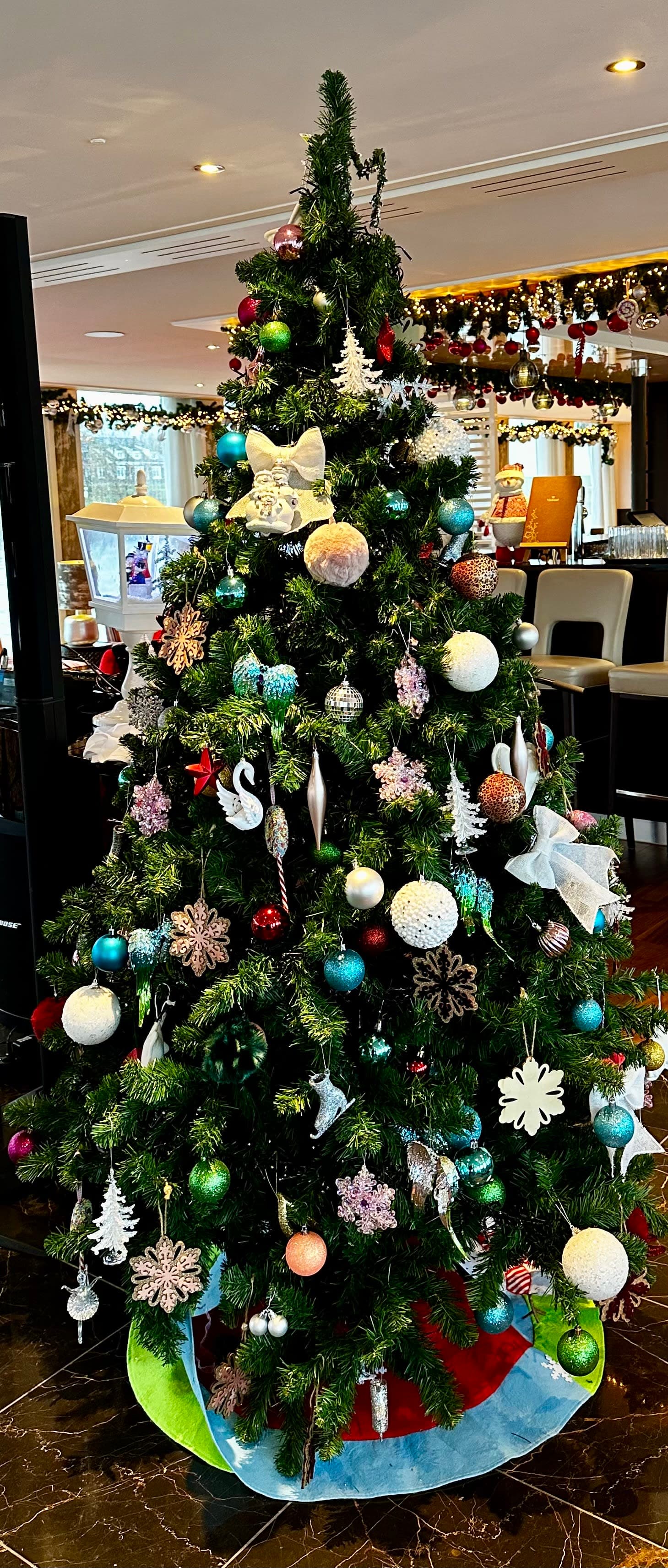 The ship was beautifully decorated for Christmas, from the front desk, to the lounge, and even each individual stateroom door. I stayed in a stateroom with a French balcony, with floor to ceiling windows. It was always bright, even at this time of year when Europe has less sunshine. It was very comfortable, updated and housekeeping kept it immaculate.