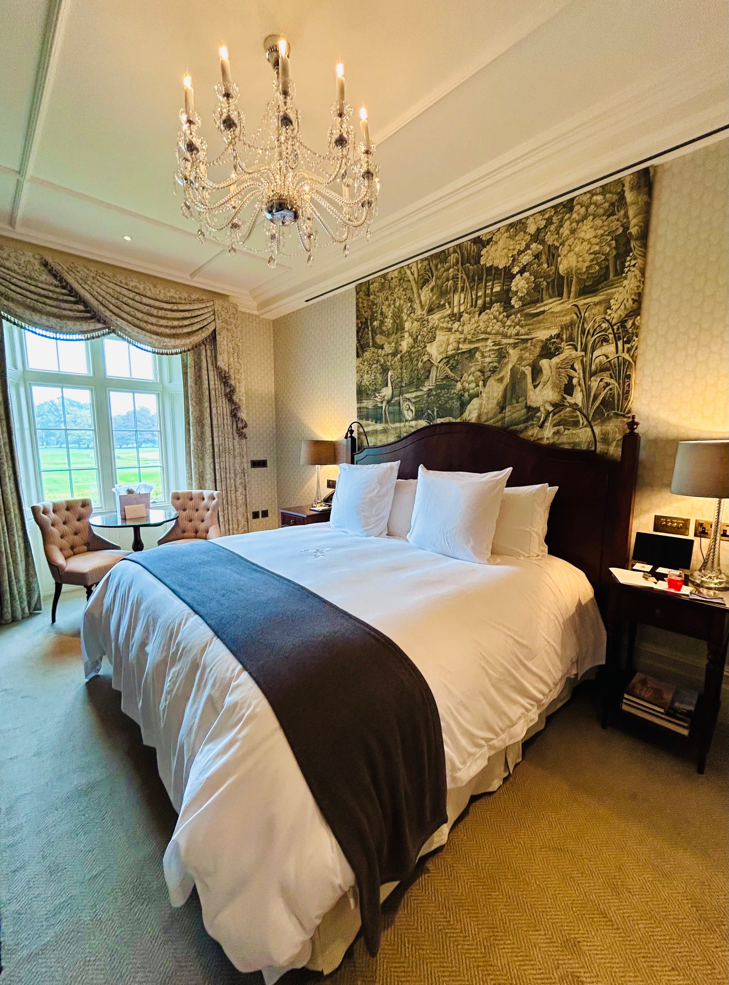 Stepping into The Great Hall Reception sets the tone for your stay. It features a soaring, wood-paneled ceiling adorned with intricate details, a grand fireplace (sadly no fire though since I visited in August) and a plush seating area that invites you to relax and unwind. Despite its enormous size, there are only 103 rooms and eight suites at Adare, categorized as Deluxe Rooms, Staterooms and Suites. For larger groups or families, there are also three to four bedroom villas on the grounds just 15 minutes from the Manor house.