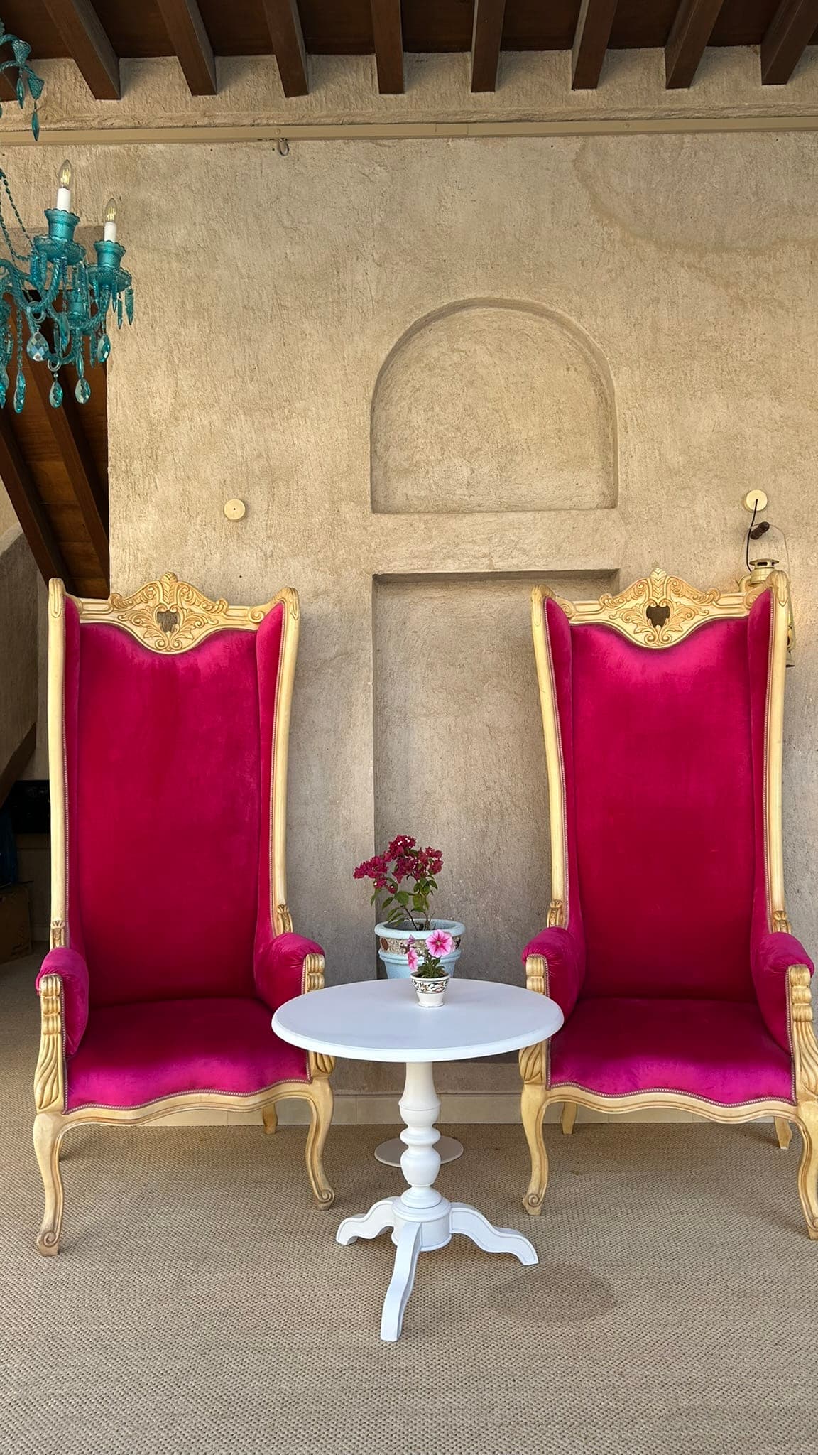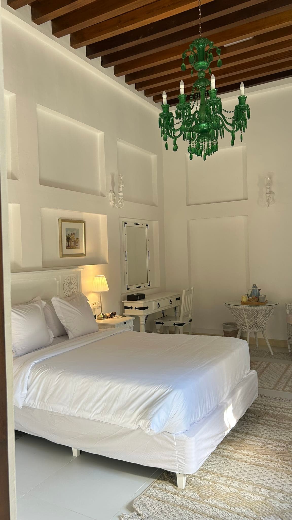 The Arabian Boutique Hotel's rooms are bright and airy, incorporating traditional patterns with light wood and wicker furniture. The building itself is a traditional two-story building, including barjeel wind towers, which bring cooler and cleaner air inside. The hotel is sprinkled with funky touches, such as brightly-colored decorative chandeliers and equally bright velveteen throne chairs. The whole property has a calm energy about it, while the area outside can get quite busy. The rooms are sheltered and block out the surrounding hustle and bustle.