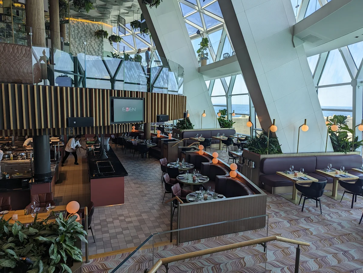 At the rear of the ship is Eden; The multipurpose space that houses Eden Bar, the Eden restaurant, and hosts performances throughout the day. Filled with plants, wood accents, and plenty of natural light, this space is a favorite for many who come on board.