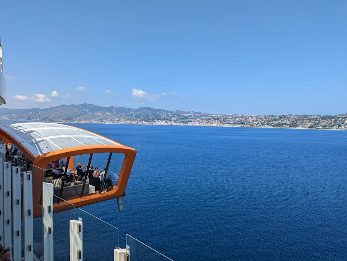 Deck 15 features two glass plunge pools against the side of the ship; the rooftop garden, a multi use space that would often host pickleball, or show movies or sporting events on a large screen; the rooftop garden grill, an al fresco dining option at an extra charge; and the sunset bar at the very back of the ship, with a moroccan theme, refreshing cocktails, and some of the best views on the ship. This was a favorite of many guests for sailaways, and also where the daily LGBTQ+ gatherings were hosted. A great touch of inclusion for Queer guests, which helped me meet friends who I would spend time with throughout the cruise.