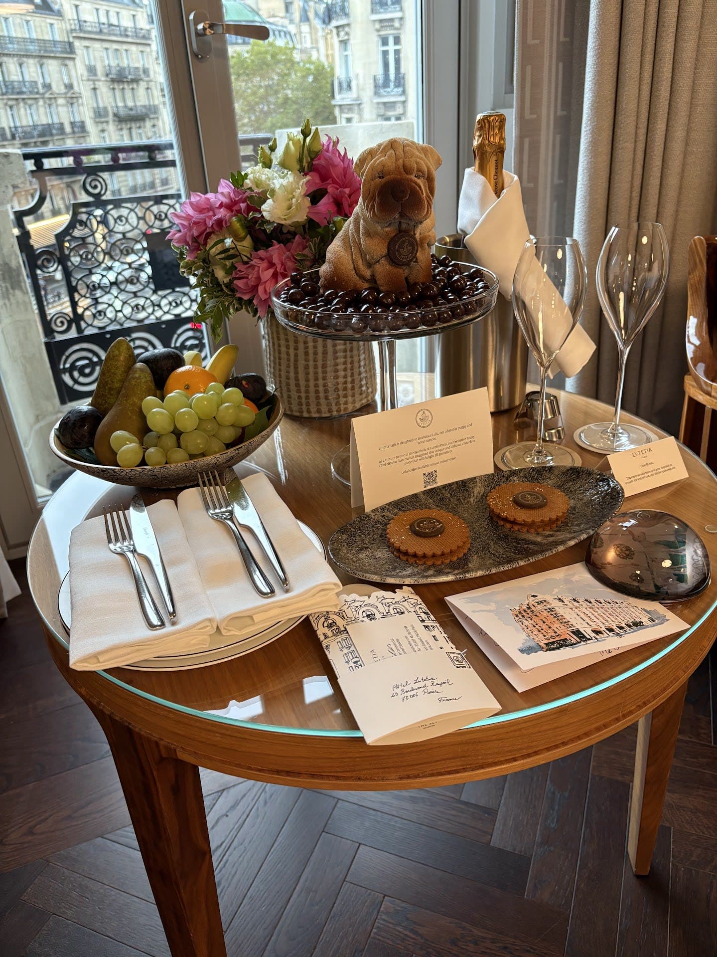The concierge team went above and beyond, guiding us to incredible dining options, including Les Antiquaires, where the beef bourguignon was simply unforgettable! Our room was sleek and modern, with a thoughtful touch that took my breath away: our initials embroidered on the pillowcases. As if that weren’t enough, we were greeted with a signature creation from their pastry chef—an adorable dog made entirely of chocolate!
