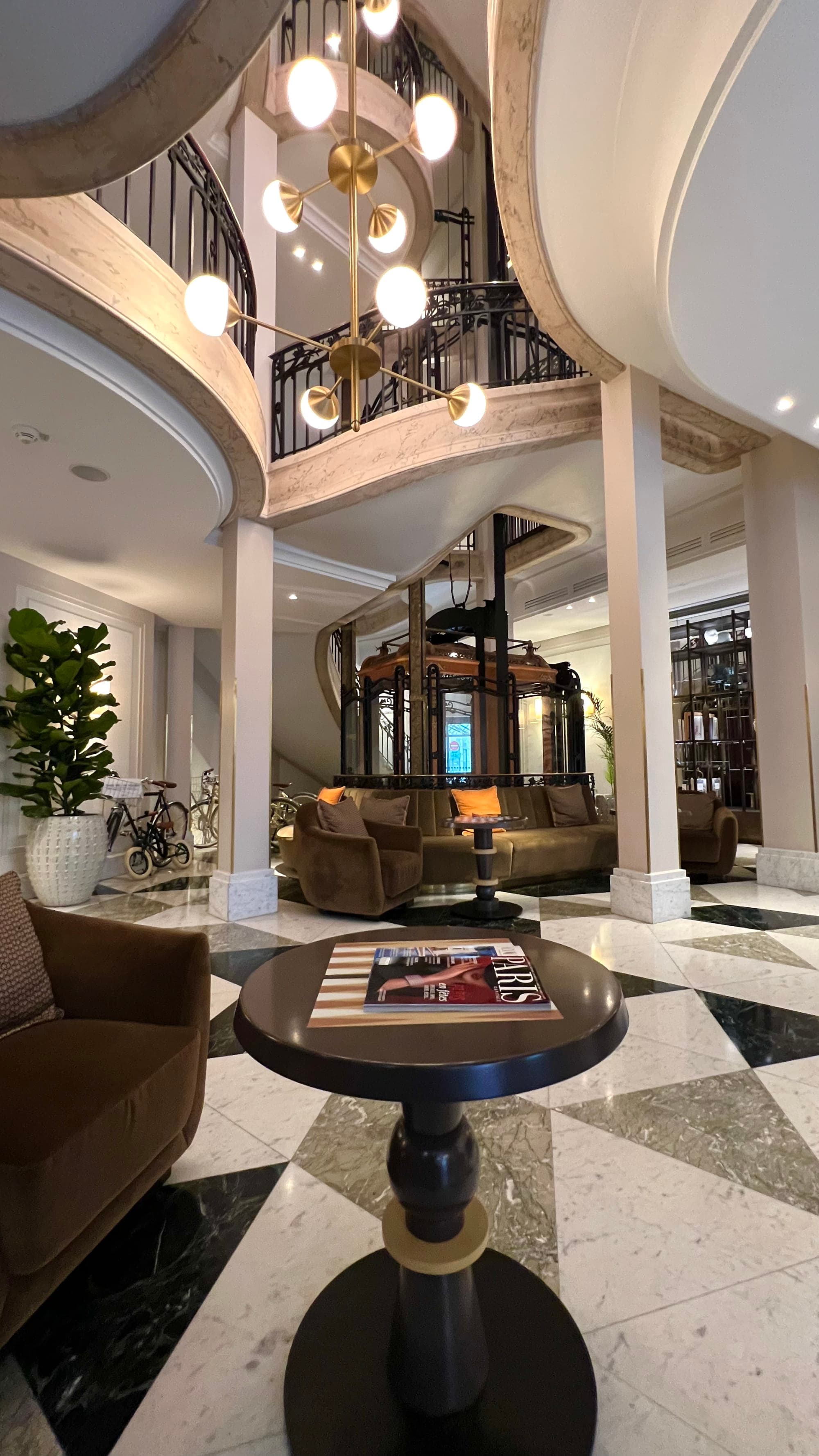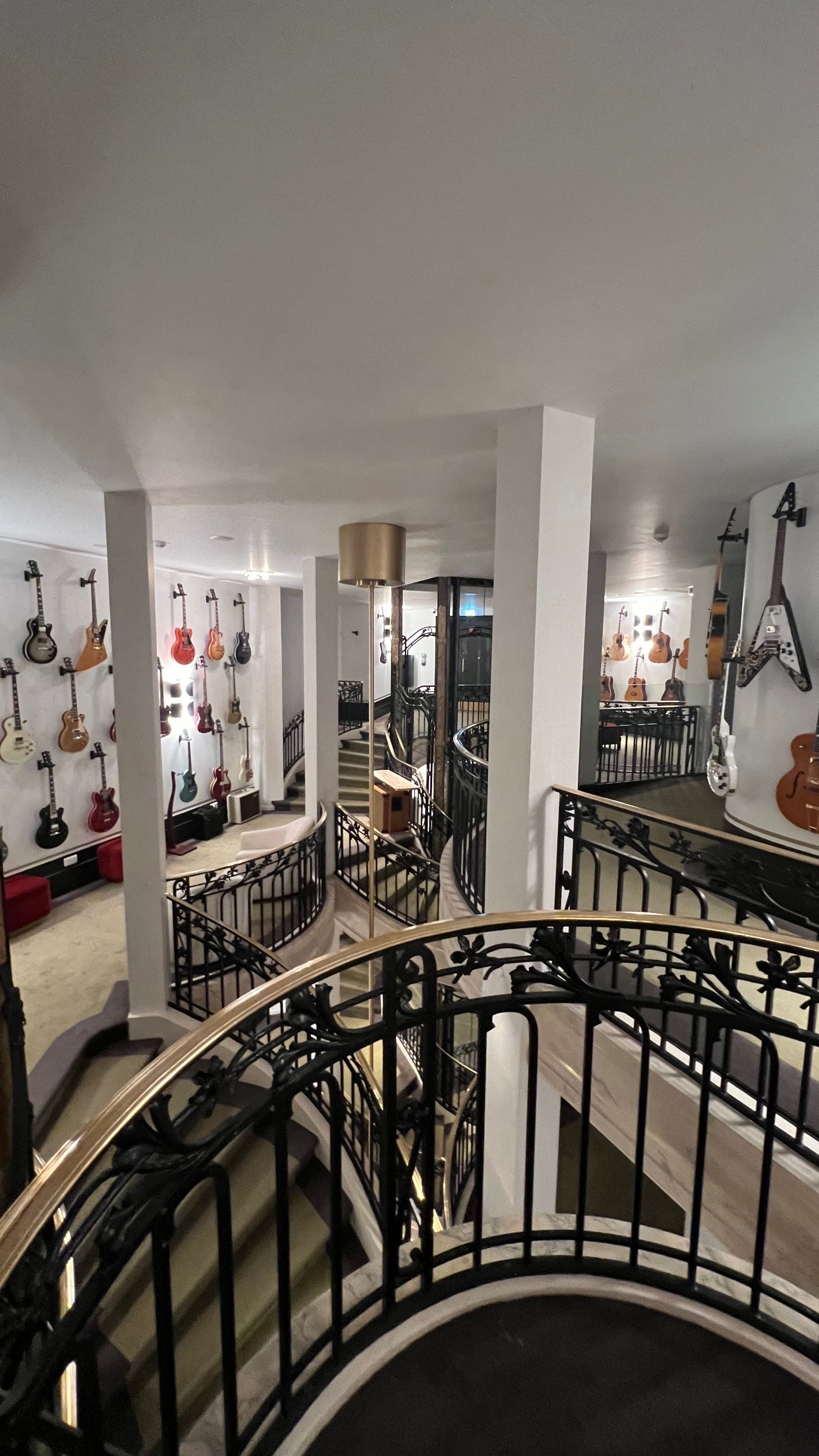 Above the lobby, featuring historic guitars; Lobby of Kimpton St Honoré Paris